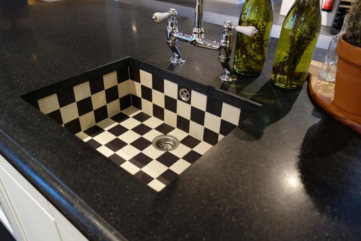 Plak alle randen van de tegels keukenapparatuur houtwerk en het aanrecht af met afplaktape. Deze gave lampvoet is zwart van kleur. De zwart witte keukens zien we dan ook steeds vaker terug.